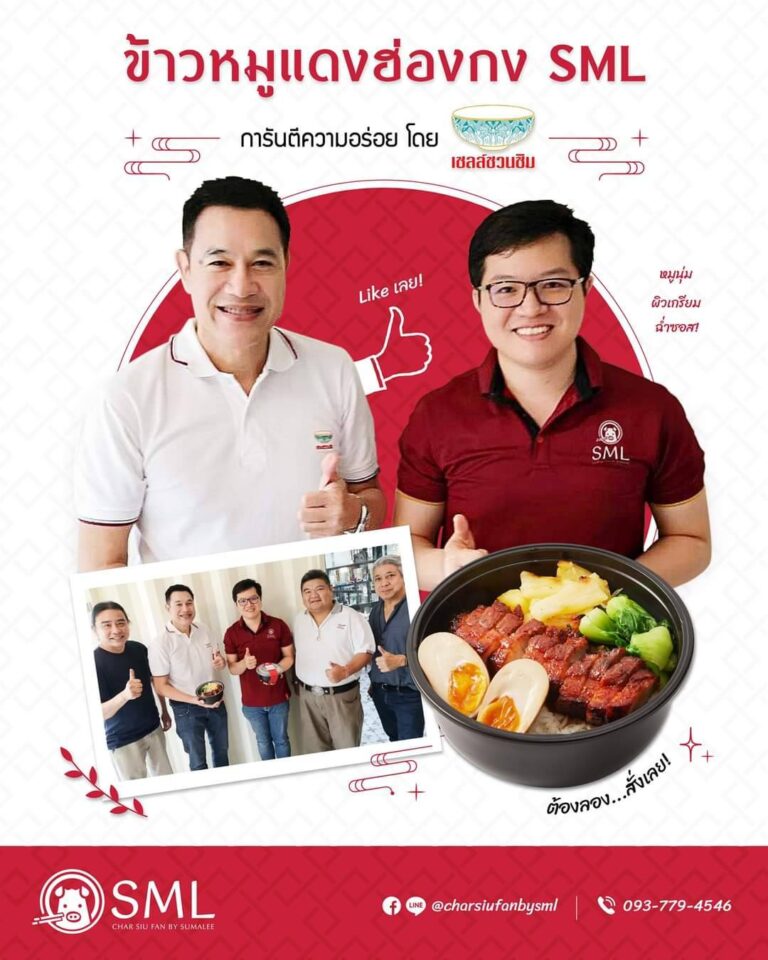 ช้าซิ้วฝ่าน บาย SML (Char Siu Fan By SML) หรือ ข้าวหมูแดงฮ่องกง SML ซึ่งคำว่า SML นี้มาจากตัวย่อของชื่อคุณแม่วัย 73 ปี ของน้องเอ็กซ์เจ้าของร้าน คุณแม่ สุมาลี โอวะกุลวงศ์ เจ้าของโรงงานพลาสติกซึ่งเจียดเวลาทำข้าวกลางวันให้ครอบครัวมาตั้งแต่ยังสาว ชอบไปหาของอร่อยกินที่ฮ่องกงทุกปี ๆ ละ 2 ครั้ง อยู่เมืองไทยหาหมูแดงอร่อยเหมือนในฮ่องกงไม่ได้ จึงต้องทำเองเสียเลย